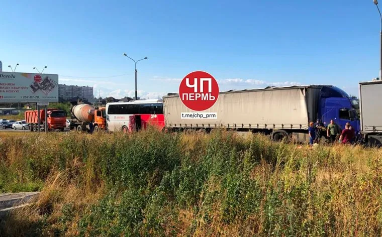 В Перми неподалеку от Восточного обхода столкнулись несколько большегрузов и автобус. Сейчас на этом месте скапливается большая пробка.