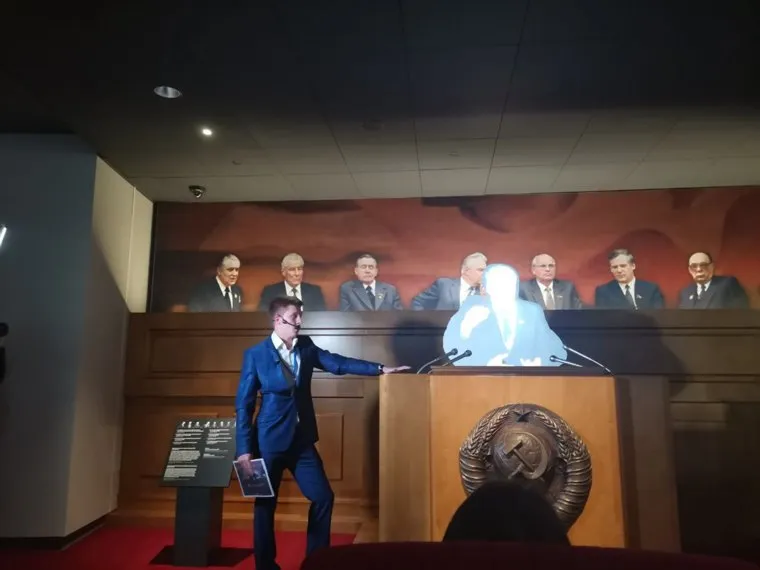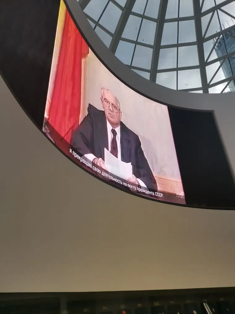 В финале экскурсии посетители смогли увидеть телеобращения Горбачева, где он подводит итоги своего правления и сообщает о своей отставке
