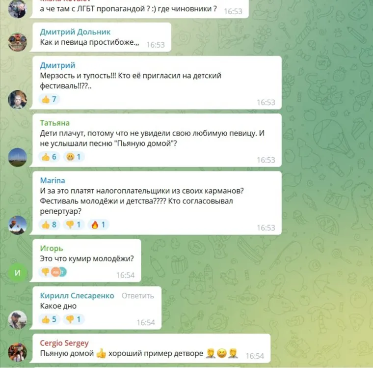 «Песня для фестиваля детства… Что же там для взрослых?», — написал пользователь Alex в комментариях к новости по теме в telegram-канале Newsvlru. «Вот это фестиваль детства и юношества! Надеюсь, тот, кто это устроил, уже заявление по-собственному пишет», — негодует другой пользователь. «Это что, кумир молодежи? Какое дно», — добавляет третий.