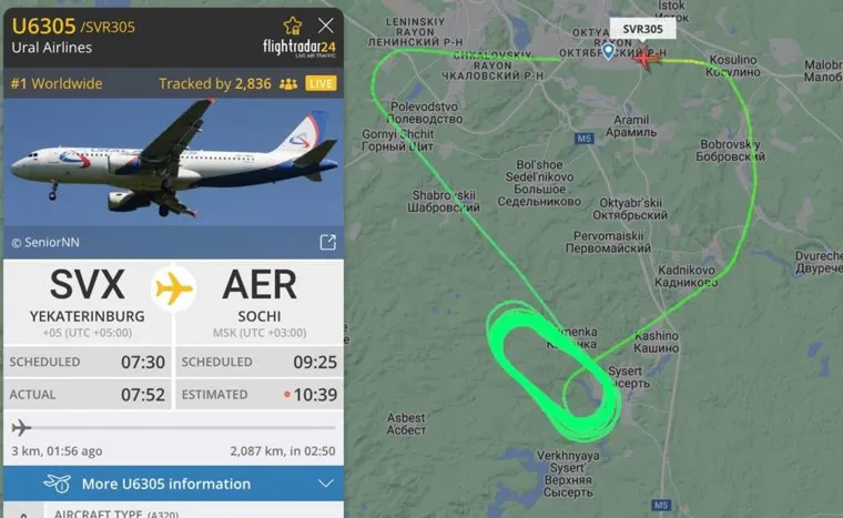 «Во время выполнения рейса U6-305 по маршруту Екатеринбург — Сочи на этапе взлета обнаружилась неисправность в системе уборки шасси. Сейчас самолет вырабатывает топливо для посадки в аэропорту Кольцово», — сказано в сообщении.