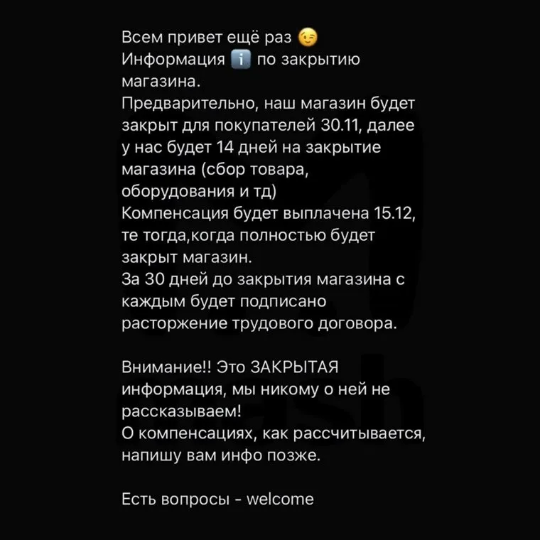 «Информация по закрытию магазина. Предварительно, наш магазин будет закрыт для покупателей 30.11, далее у нас будет 14 дней на закрытие магазина (сбор товара, оборудования и т. д.). Компенсация будет выплачена 15.12, то есть тогда, когда полностью будет закрыт магазин», — говорится в письме. При этом подчеркивается, что за 30 дней до полного закрытия H&M с каждым сотрудником будет подписано расторжение трудового договора.