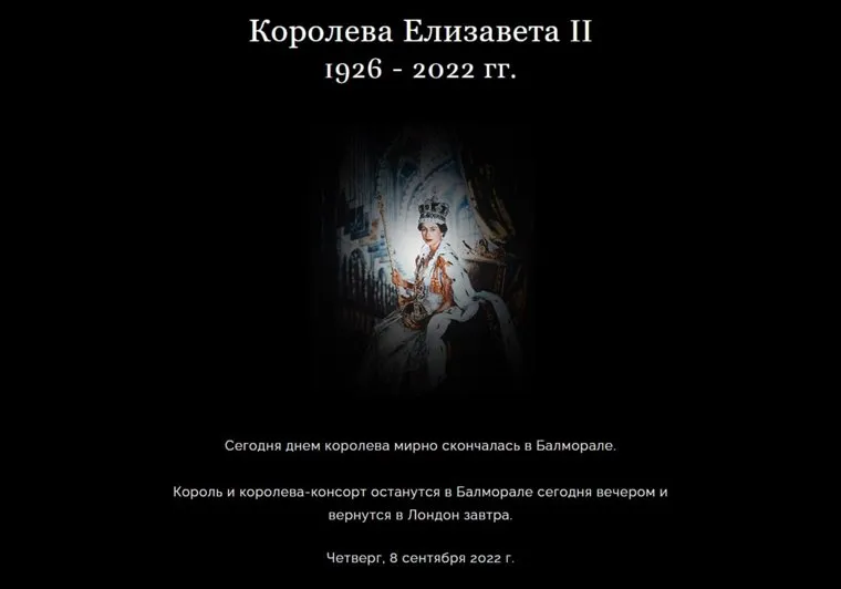 «Сегодня днем королева мирно скончалась в Балморале», — указано на сайте Букингемского дворца. Сам сайт закрыл все разделы, его оформление теперь выполнено в черном цвете.