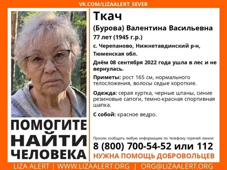 «Помогите найти человека! Пропала Ткач (Бурова) Валентина Васильевна, 77 лет. Село Черепаново, Нижнетавдинский р-н, Тюменская обл. Днем 8 сентября 2022 года ушла в лес и не вернулась», — говорится в сообщении поисковиков.