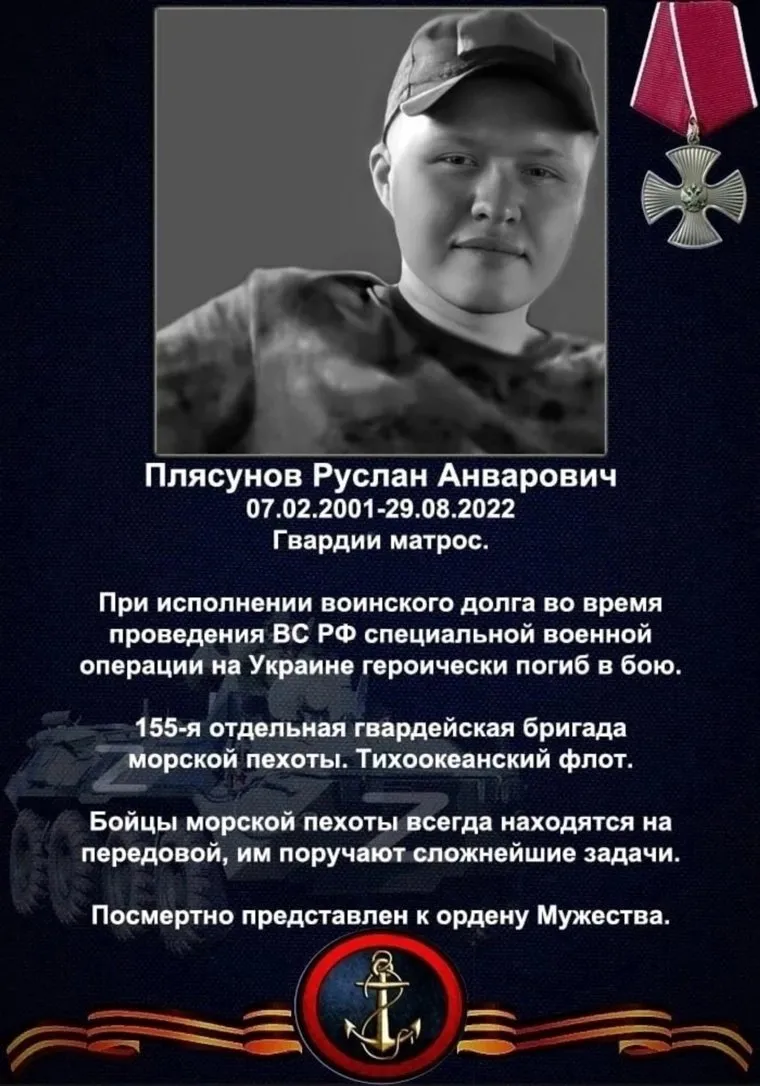 Во время спецоперации на Украине погиб уроженец города Березники Пермского края Руслан Плясунов. Он проходил службу в 155-й отдельной гвардейской бригаде морской пехоты Тихоокеанского флота. Информация размещена в группе березниковского строительного техникума в соцсети «ВКонтакте».
