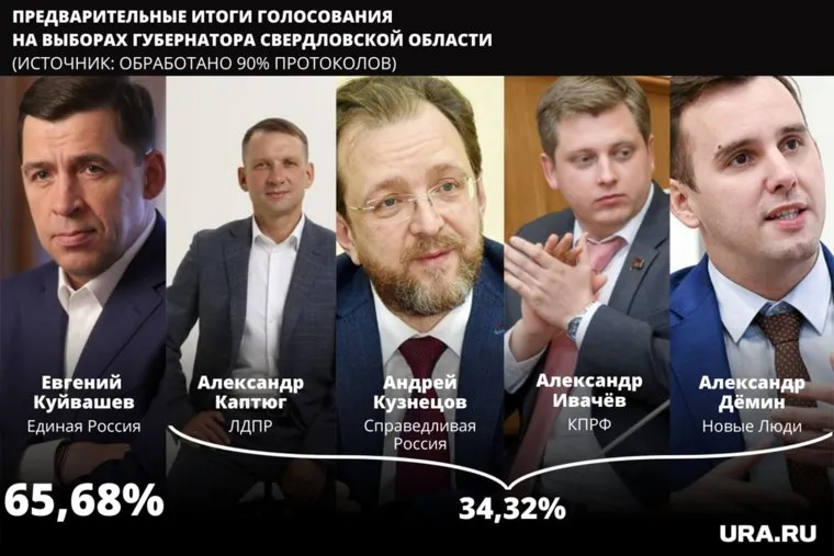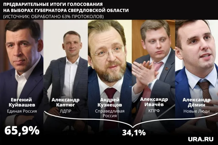 22:16 11.09.2022 Источник URA.RU в облизбиркоме сообщает, что после обработки 63% протоколов по региону действующий губернатор Свердловской области Евгений Куйвашев лидирует на выборах главы региона с 65,9% голосов.