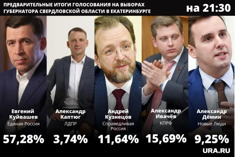 21:24 В Екатеринбурге, по данным URA.RU, обработано 48% протоколов участковых избирательных комиссий. По предварительным данным, Евгений Куйвашев набирает 57,28% (пять лет назад губернатор набрал в городе 48%). На втором месте идет вице-спикер заксо Александр Ивачев (КПРФ, 15,69%), третий — депутат Госдумы Андрей Кузнецов («Справедливая Россия», 11,64%), четвертый — его коллега Александр Демин («Новые люди», 9,25%), пятый — депутат заксо Александр Каптюг (ЛДПР) — 3,74%.
