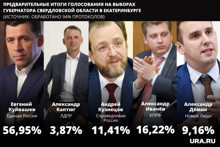 22:48 На выборах в Екатеринбурге губернатор Евгений Куйвашев с 56,95% голосов, сообщил источник URA.RU в облизбиркоме по итогам обработки 94% протоколов УИК.