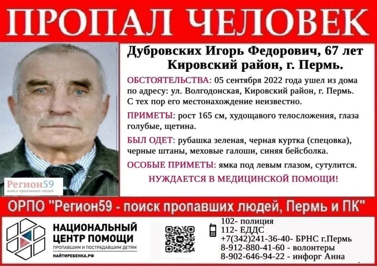 Особые приметы: ямка под левым глазом, сутулится. 5 сентября 2022 года пенсионер ушел из дома, с тех пор его местонахождение неизвестно. Тех, кому известно местоположение Игоря Федоровича, просят сообщить по телефонам 02, 102, 112, +7-342-241-36-40, +7-912-880-41-60, +7-902-646-94-22.