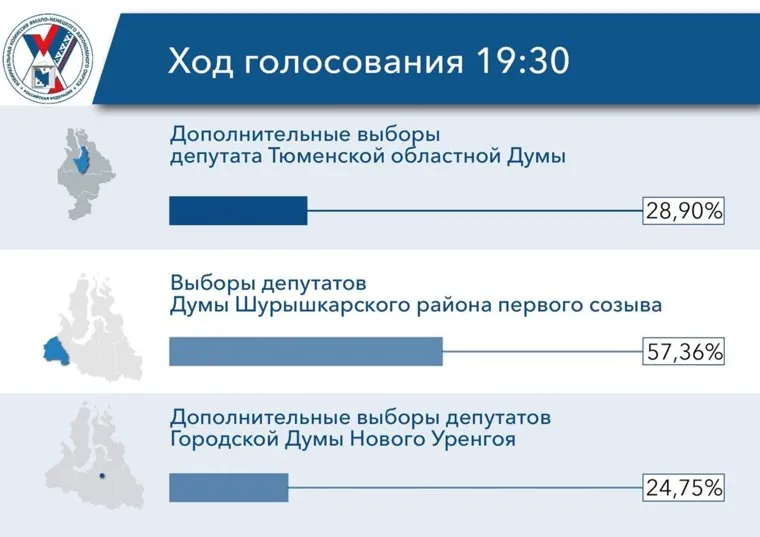 Как сообщается в telegram-канале избиркома, за полчаса до закрытия участков явка составила на выборах депутатов Думы Шурышкарского района — 57,36%, на выборах депутатов городской думы Нового Уренгоя — 24,75%, на выборах депутата Тюменской облдумы — 28,9%. На Ямале работали 75 избирательных участков.