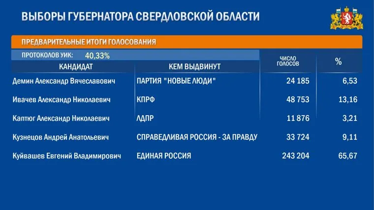 По итогам подсчета 100% протоколов УИК, Куйвашев набрал 65,67% голосов