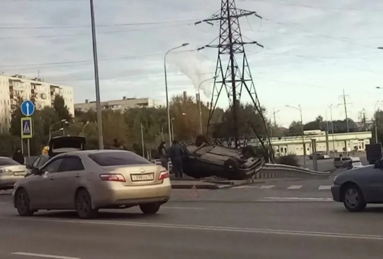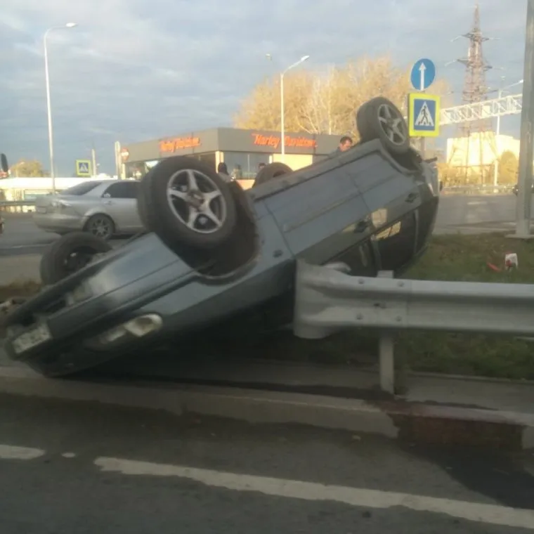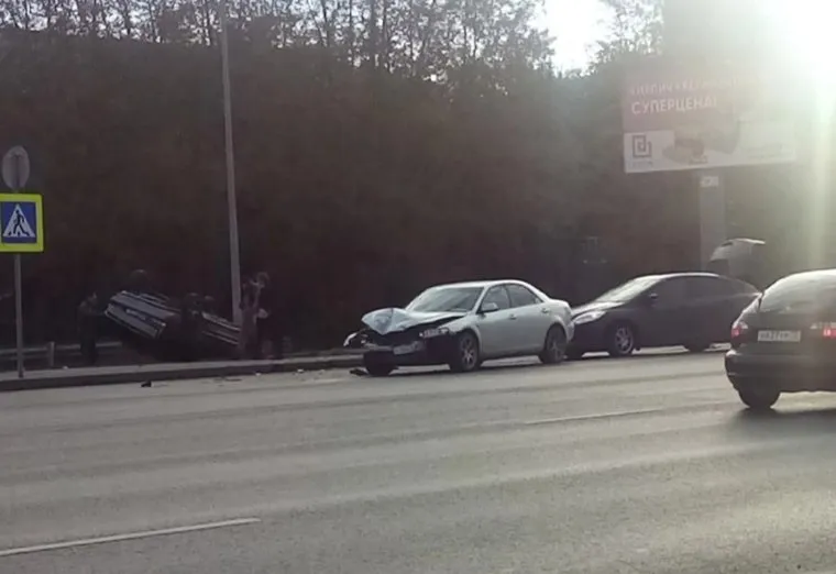 В Тюмени на улице Республики в ДТП перевернулся автомобиль. Фото
