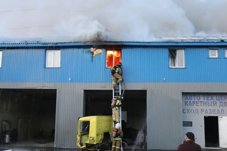 В Ханты-Мансийске огнем охвачена производственная база рядом с автозаправкой. Фото, видео