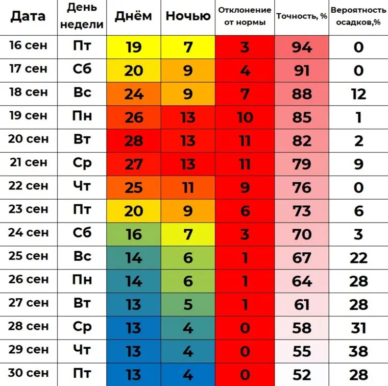 «Пик ожидается 20—21 сентября. В эти дни воздух будет прогреваться до +27…+28?, что сопоставимо с рекордными температурами предыдущих лет. Возможно установление новых рекордов. Теплая погода продержится до 24 сентября, а затем ожидается понижение температуры до климатической нормы. Днем +12…+14?, ночью +3…+7?», — рассказал Илья Винштейн.