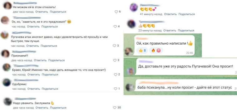 «Пугачева уже давно иноагент, надо удовлетворить ее просьбу — и чем быстрее, тем лучше», — считает пользователь. «Надо уважить [Пугачеву]. Заслужила!», — пишет другой пользователь.