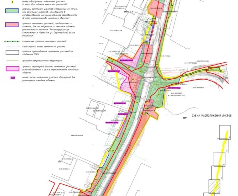 На чертеже представлен один из участков улицы Соликамской, которую планируется реконструировать — на нем показана примыкающая к Соликамской улица Гашкова. Участки, предлагаемые к изъятию, выделены красным цветом