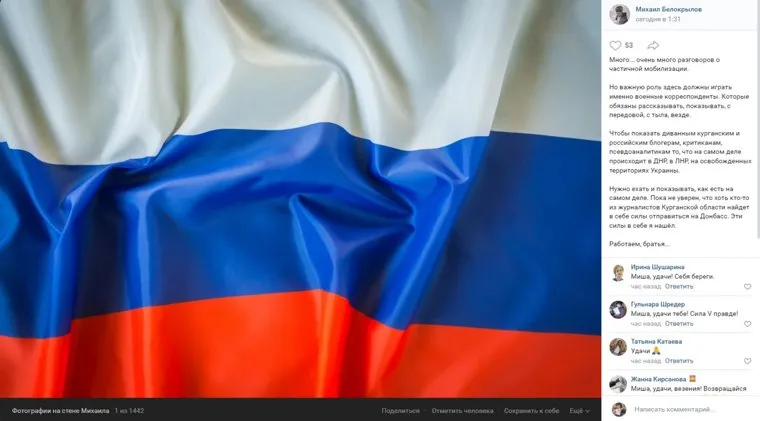 «Очень много разговоров о частичной мобилизации. Важную роль здесь должны играть именно военные корреспонденты. Которые обязаны рассказывать, показывать, с передовой, с тыла, везде. <…> Нужно ехать и показывать, как есть на самом деле. Пока не уверен, что хоть кто-то из журналистов Курганской области найдет в себе силы отправиться в Донбасс. Эти силы в себе я нашел», — написал журналист.