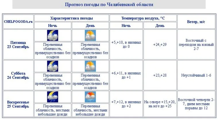 В самом Челябинске 23 и 24 сентября температура будет практически совпадать со среднеобластной — 27 градусов. В воскресенье синоптики обещают 15-17 градусов. Зато если последний выходной для большей части области будет полностью дождливым, то в столице Южного Урала осадков не ожидается.