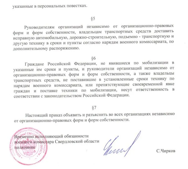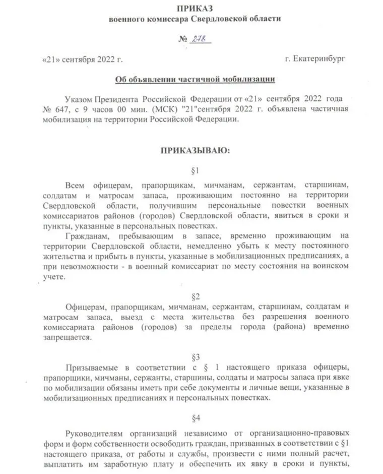 Организации при этом обязаны рассчитаться с работником, которого призвали, и обеспечить его явку в военкомат. Приказ касается тех, кто постоянно проживает в Свердловской области. Приказ был опубликован 22 сентября.