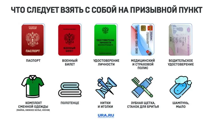Человеку, получившему повестку, следует взять с собой на призывной пункт паспорт, военный билет (для рядового состава), удостоверение личности (для офицерского состава), медицинский и страховой полисы, водительское удостоверение, комплект сменной одежды (майка, носки, нижнее белье), полотенце, нитки и иголки, предметы личной гигиены. Об этом URA.RU рассказал член президиума общероссийской общественной организации «Офицеры России», военный пенсионер, ветеран вооруженных сил РФ Юрий Чмутин.