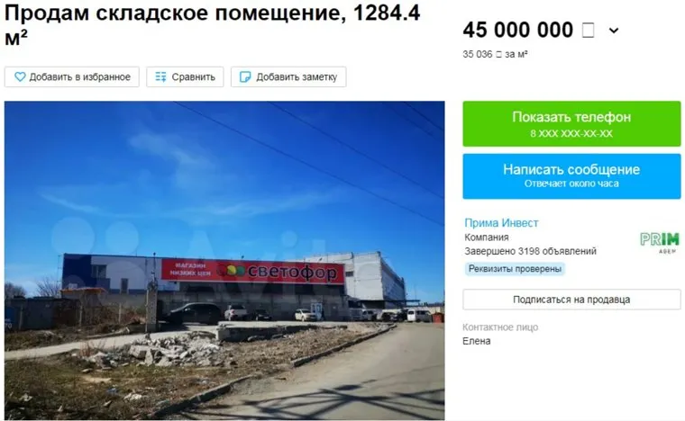 «Предлагаем торгово-офисный комплекс в районе Потребительского рынка. Отличные подъездные пути, большая территория для маневра фур. Общая площадь здания: 1284,4 кв. м., земельного участка в собственности — 3 523 кв. м.», — указано в объявлении на сайте «Авито».
