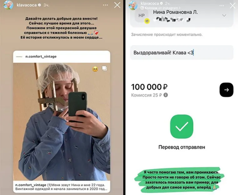 «Давайте делать добрые дела вместе! Поможем прекрасной девушке справиться с тяжелой болезнью. Ее история откликнулась в моем сердце», — написала Клава Кока, прикрепив скриншот с транзакцией.