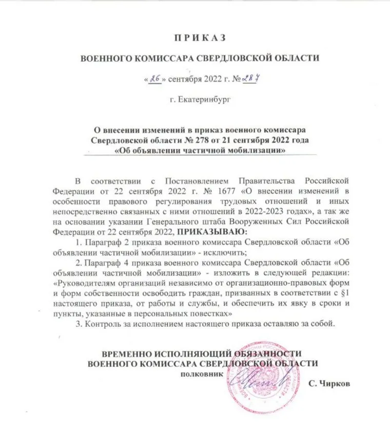 Первоначальная редакция приказа была выпущена 22 сентября. Второй параграф гласил, что военнообязанные, подлежащие частичной мобилизации, не могут выезжать за пределы города или района без разрешения военных комиссаров. Позднее приказ отредактировали: запрет стал касаться лишь выезда военных за пределы России. Теперь же пункт исключили окончательно.