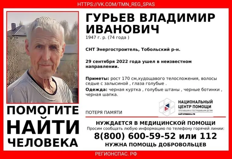 «Пропал Гурьев Владимир Иванович 1947 года рождения. 29 сентября 2022 года ушел в неизвестном направлении, СНТ „Энергостроитель“, Тобольский район. Приметы: рост 170 см, худощавого телосложения, волосы седые с залысиной, глаза голубые. Нуждается в медицинской помощи», — сообщили в поисковом отряде.