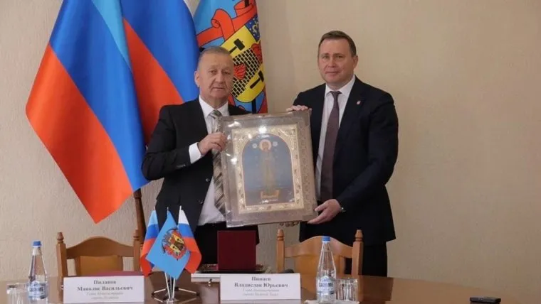Мэр Нижнего Тагила (справа на фото) поздравил жителей ЛНР с присоединением к РФ