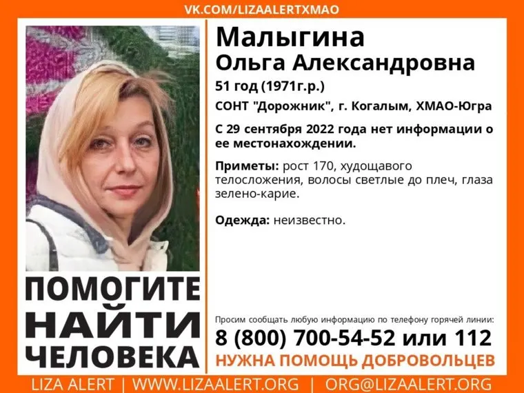 «Когалым, помогите найти человека! Пропала Ольга Малыгина, 51 год (1971 г. р.), с 29 сентября 2022 года ее местонахождение неизвестно», — сообщается в группе.