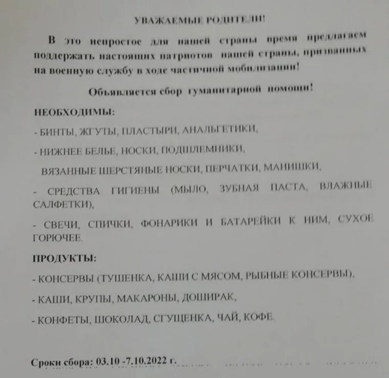 «В это непростое для нашей страны время предлагаем поддержать настоящих патриотов. Объявляется сбор гуманитарной помощи», — написано в объявлении.