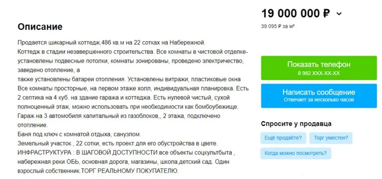 «Продается шикарный коттедж, 486 кв. м. на 22 сотках на набережной. Коттедж в стадии незавершенного строительства. <…> Есть нулевой, чистый, сухой полноценный этаж, можно использовать при необходимости как бомбоубежище», — указано в объявлении.