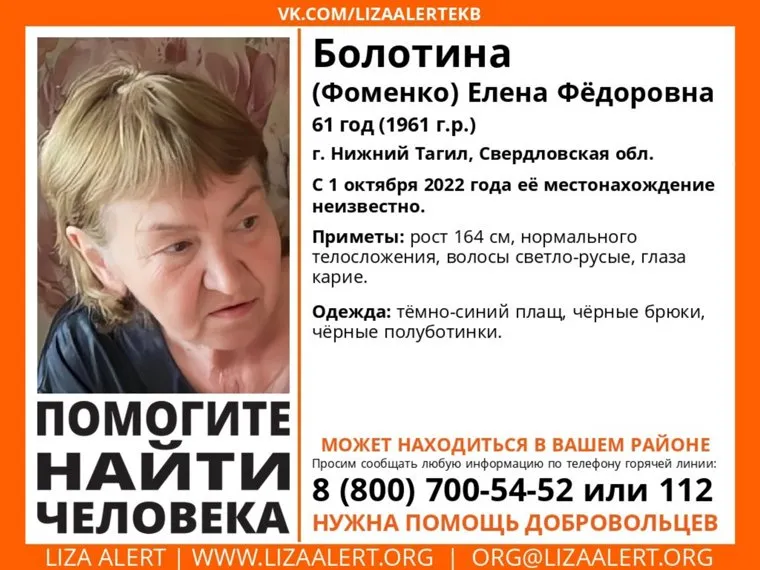 В Нижнем Тагиле (Свердловская область) 1 октября пропала 61-летняя Елена Болотина. Информацию о пропавшей пенсионерке разместили волонтеры поискового отряда «ЛизаАлерт» в соцсети «ВКонтакте».