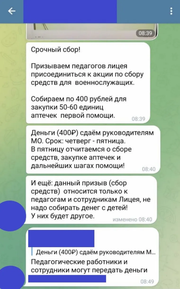 Telegram-канал «Альянс Учителей» выложил скриншот переписки во внутреннем чате одного из пермских лицеев. Название учреждения не уточняется. «Призываем педагогов лицея присоединиться к акции по сбору средств для военнослужащих. Собираем по 400 рублей для закупки 50-60 единиц аптечек первой помощи. Деньги сдаем руководителям», — говорится в сообщении.