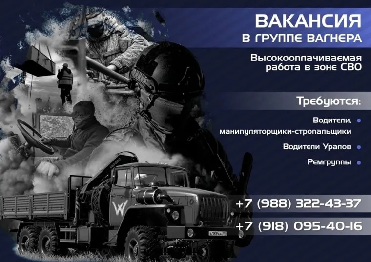 «Вакансия в „Группе Вагнера“. Требуются: водители, манипуляторщики-стропальщики, водители Уралов, ремгруппы. Высокооплачиваемая работа в зоне СВО», — говорится в сообщении.