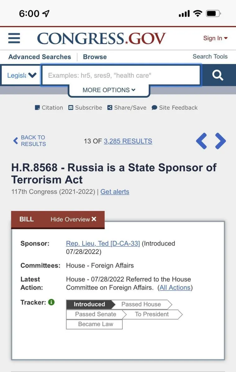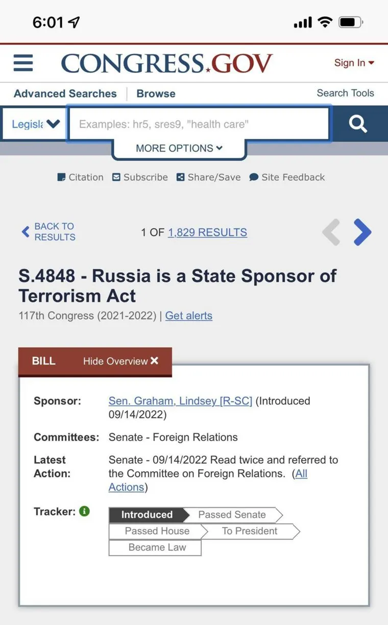 В Конгресс США внесли законопроект о признании РФ спонсором терроризма. Скрин