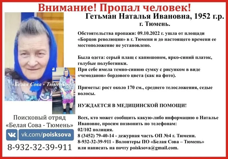 «Пропал человек! Гетьман Наталья Ивановна 1952 года рождения. 9 октября 2022 года ушла от площади „Борцов революции“ в Тюмени и до настоящего времени ее местоположение не установлено», — говорится в сообщении поисковиков.