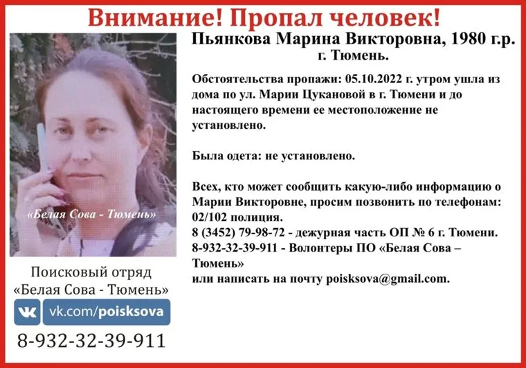 Всех, кто располагает какой-либо информацией о местоположении Марины Пьянковой, отряд просит обращаться в отдел полиции №6 города Тюмени по номеру телефона: (3452) 79-98-72, либо непосредственно в поисковый отряд «Белая Сова-Тюмень» по телефону: 8-932-323-99-11.