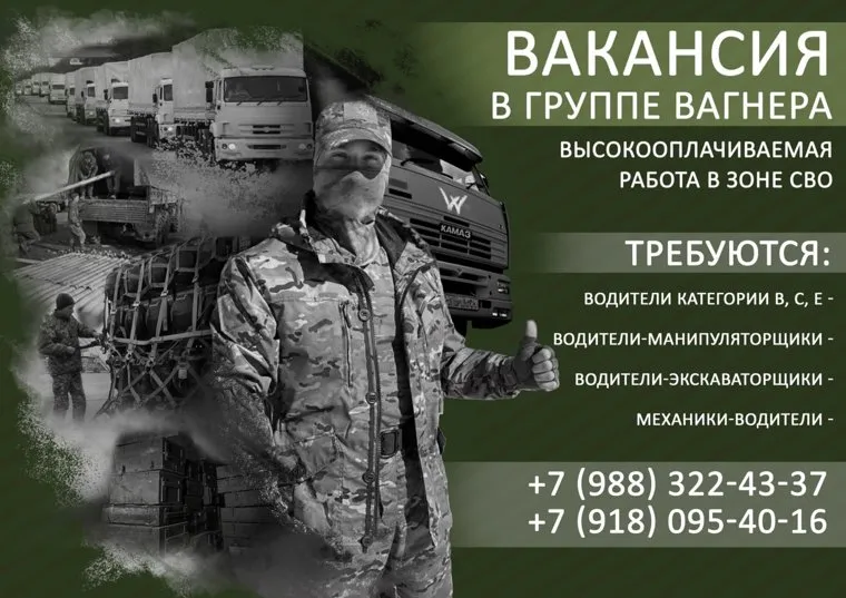 «Вакансия в „Группе Вагнера“. Требуются: водители категории B, C, E, водители-манипуляторщики, водители-экскаваторщики, механики-водители. Высокооплачиваемая работа в зоне СВО», — говорится в сообщении.