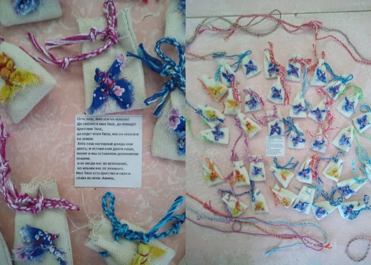«В рамках акции, проводимой областным домом народного творчества, активисты студии рукодельниц „Искусница“ сшили мешочки с молитвой в поддержку мобилизованных ребят. Распечатали молитву „Отче Наш“, заламинировали, чтобы подольше хранилось. Скрутили шнурочки для мешочков, еще пришили к ним птичек счастья», — написала на своей странице активистка Катя Красилова.