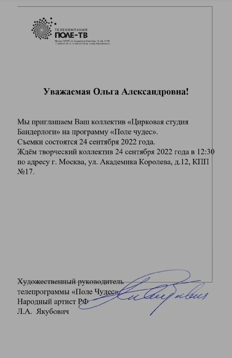 Приглашение для коллектива «Бандерлоги» для участия в шоу