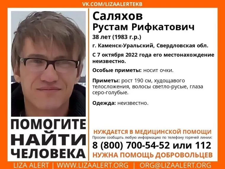 В Каменске-Уральском (Свердловская область) пропал 38-летний Рустам Саляхов. Волонтеры поискового отряда «ЛизаАлерт» в соцсети «ВКонтакте» сообщают, что мужчина покинул дом 7 октября.