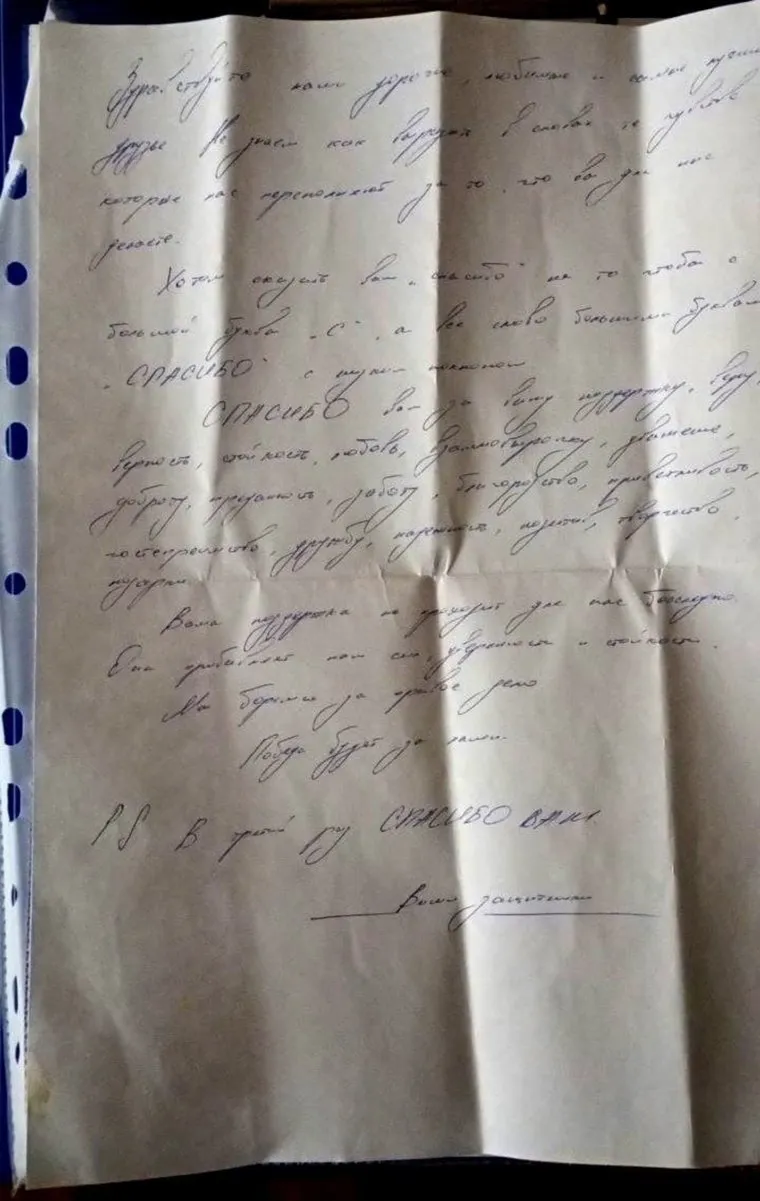 «Здравствуйте наши дорогие, любимые и самые лучшие друзья. Не знаем, как выразить в словах те чувства, которые нас переполняют за то, что вы для нас делаете. Хотим сказать вам „спасибо“ не то, что с большой буквы „с“, а все слово большими буквами „СПАСИБО“ с низким поклоном», — написали бойцы в письме, опубликованном в группе «Шьем для наших Озерск» в «ВКонтакте».