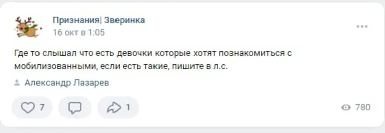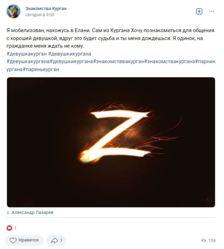 «Я мобилизован, нахожусь в Елани. Сам из Кургана. Хочу познакомиться для общения с хорошей девушкой, вдруг это будет судьба и ты меня дождешься. Я одинок, на гражданке меня ждать некому», — пишет пользователь Александр Лазарев в группе «Знакомства Курган». Аналогичный пост он опубликовал сразу в нескольких группах для знакомств в Кургане и районах области.