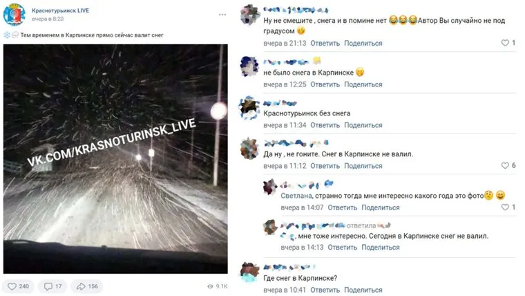 «Тем временем в Карпинске прямо сейчас валит снег», — пишет сообщество «Краснотурьинск Live» в соцсети «ВКонтакте». Правда, большинство жителей стали опровергать такую информацию. «Ну, не смешите, снега и в помине нет. Автор, вы случайно не под градусом?», — задается вопросом женщина. «Да ну, не гоните. Снег в Карпинске не валил», — пишет другая девушка.