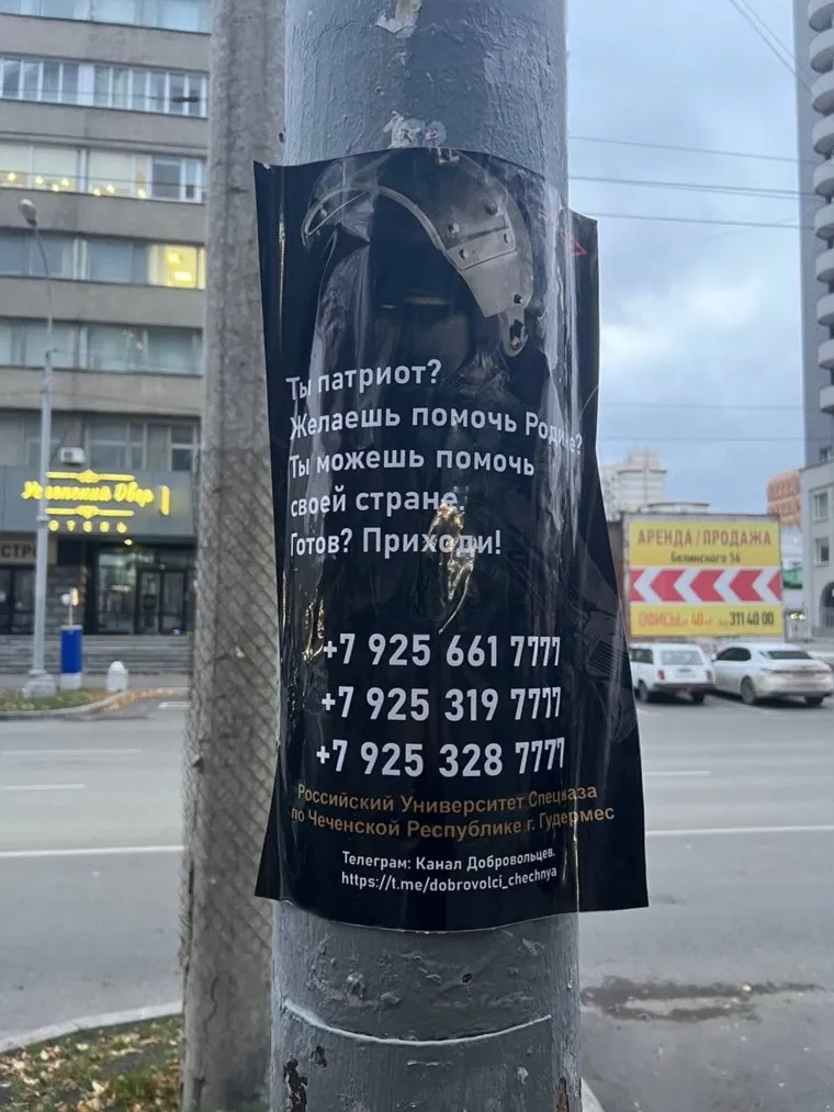 На улице Белинского в Екатеринбурге заметили объявление о приглашении пройти обучение в Российском университете спецназа, находящемся в городе Гудермес (Чеченская Республика). Фотографией объявления с URA.RU поделился читатель.
