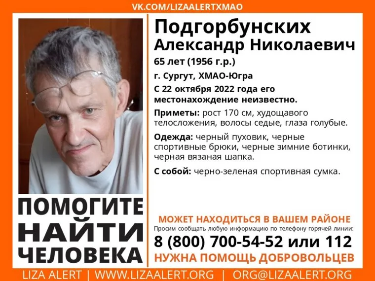 «Сургут, внимание! Помогите найти человека! Пропал Александр Подгорбунских, 1956 г. р. С 22 октября 2022 года его местонахождение неизвестно», — сообщается в группе.