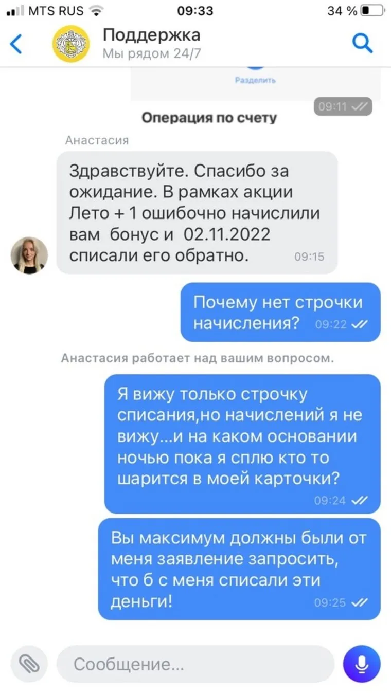 Переписка тюменка со службой поддержки «Тинькофф» банка