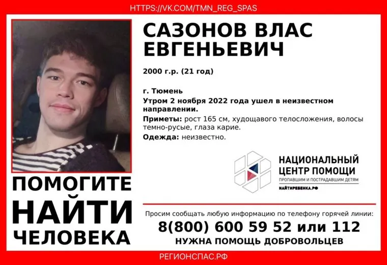 «Сазонов Влас Евгеньевич, 21 год. Утром 2 ноября ушел в неизвестном направлении», — говорится в ориентировке. Приметы пропавшего: рост 165 см, худощавого телосложения, волосы темно-русые, глаза карие. Во что был одет — неизвестно.