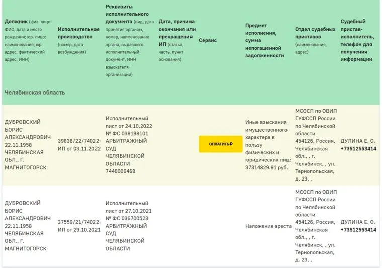 «В отношении должника Дубровского Бориса Александровича (22.11.1958 г. р.) Челябинская область, город Магнитогорск, введено исполнительное производство №39838/22/74022 от 03.11.2022 года. Предмет исполнения — взыскания имущественного характера в размере 37 млн 314 тыс. 829 рублей», — говорится в базе данных судебных приставов по Челябинской области.