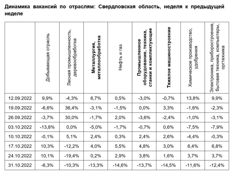 «За неделю с 31.10.2022 количество вакансий в сфере металлургии сократилось на 13,3% по сравнению с предыдущей неделей (с 24.10.2022). В сфере тяжелого машиностроения — на 14,5%, в сфере промышленного оборудования — на 13,7%», — сообщается в исследовании.